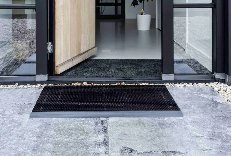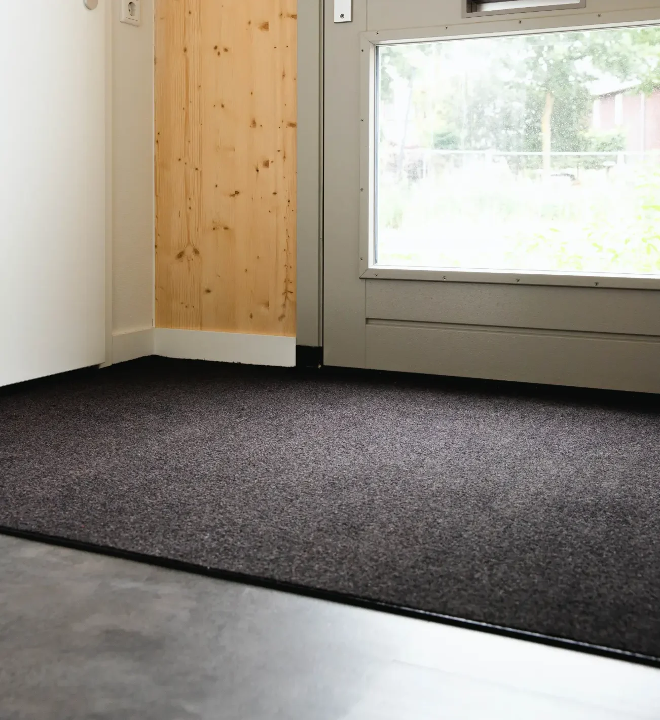 In de deuropening of net binnen ligt een schoonloopmat die het resterende vuil verwijdert en het eerste vocht vasthoudt. Zo blijft de vloer binnen langer schoon.